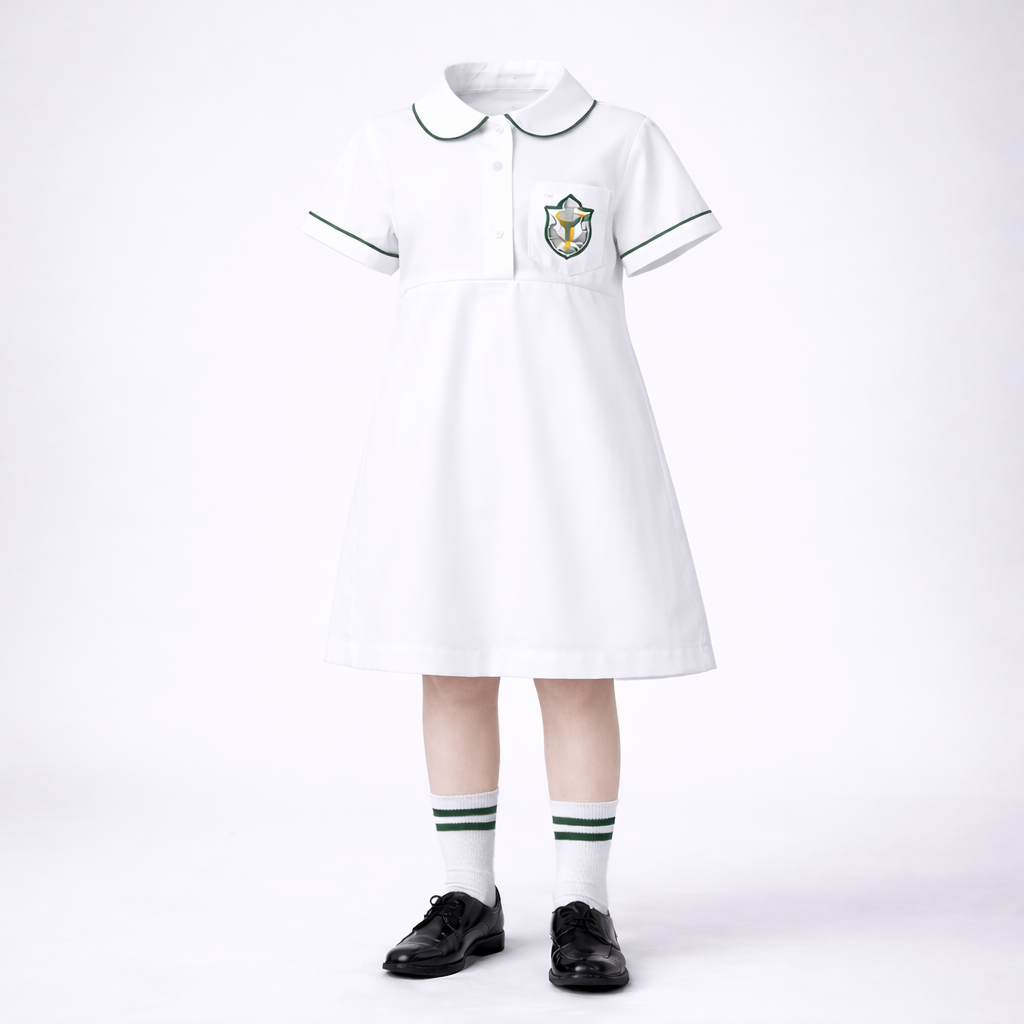 This Junior Girls Uniform features a classic white summer tunic designed for comfort, durability, and school compliance. The soft white fabric is enhanced with subtle green piping on the collar and sleeves, creating a neat and recognizable DPS-style appearance. Because junior students require breathable and easy-to-manage uniforms, this design balances structure with everyday comfort.